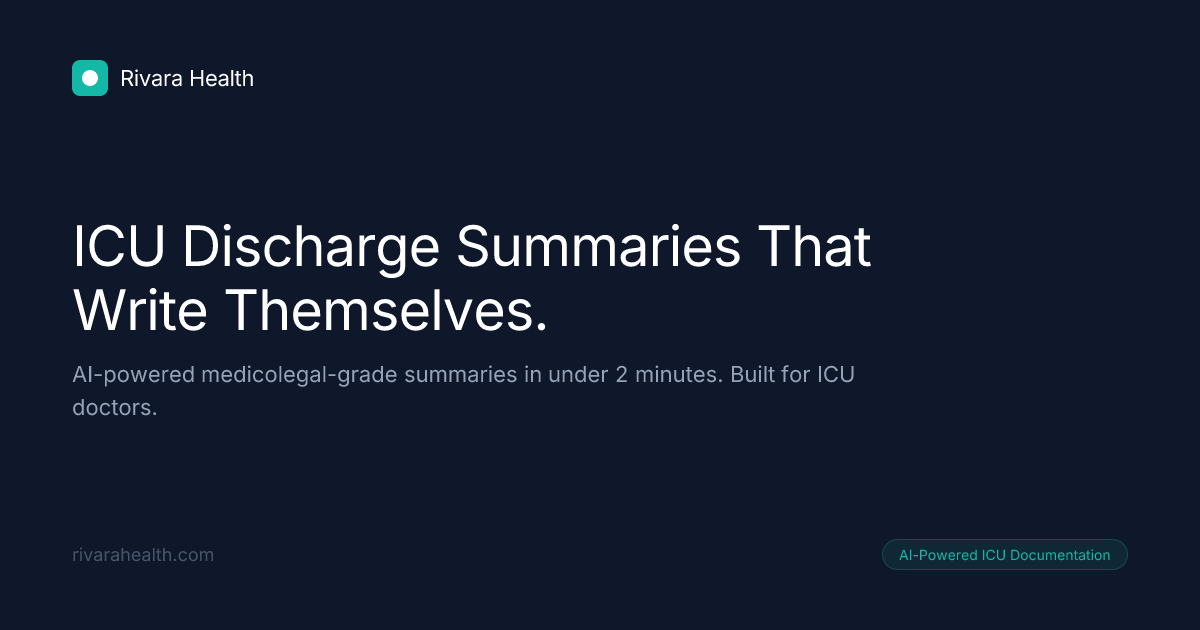 Rivara Health is a healthcare technology company providing an AI-powered clinical documentation platform specifically designed for ICU teams. It automates the generation of medicolegal-grade discharge and death summaries, tracks SOFA scores, and ensures TPA insurance compliance, significantly reducing administrative time for clinicians.